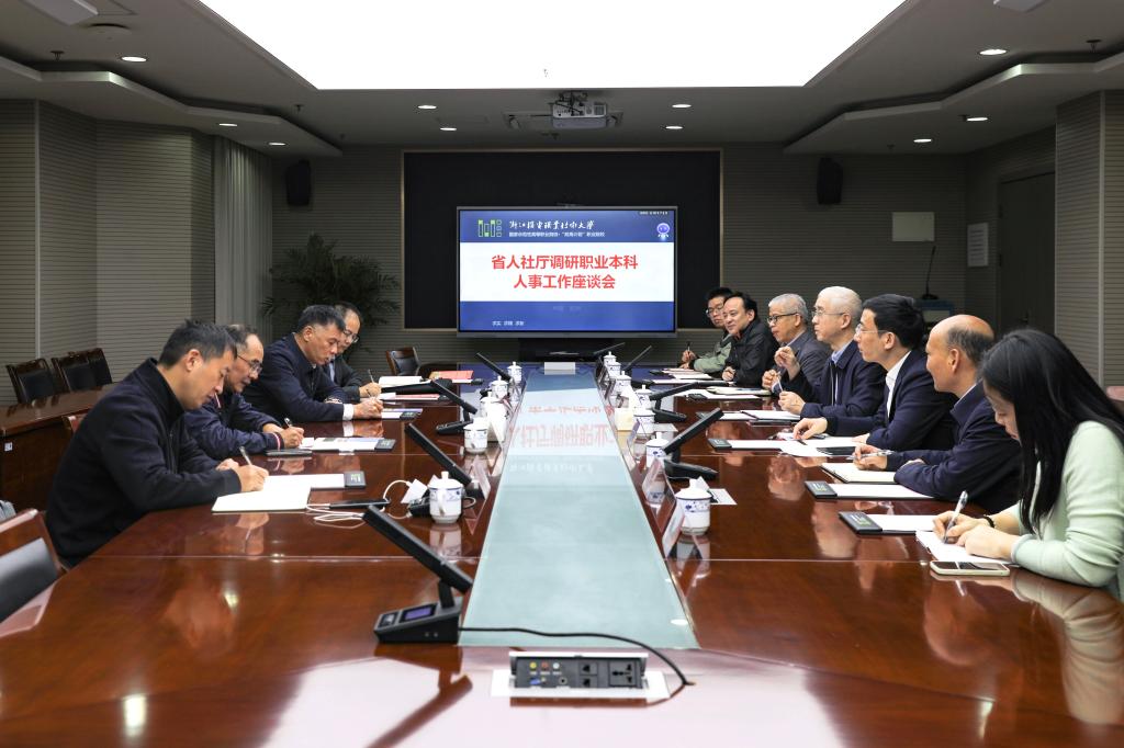 11月12日,浙江省人力资源和社会保障厅党组成员、副厅长、一级巡视员金林贵一行来到浙江机电职业技术大学调研学校办学体制调整后的人事管理及收入分配等工作。校长贺星岳、副校长朱润晔、党委委员王斌陪同调研。省人社厅相关处室负责人、学校相关职能部门负责人参加调研。