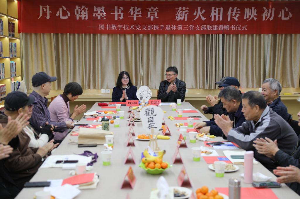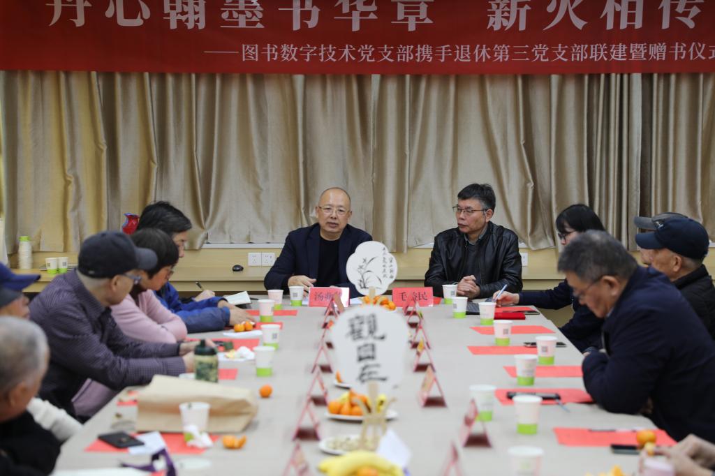 活动期间,还在滨江校区图书馆三楼教研支持中心举行“丹心翰墨书华章 薪火相传映初心”支部联建暨赠书仪式,退休第三党支部与图书数字技术党支部签署《党建联建协议》,办公室、组织部、宣传部、离退休工作处、图书馆有关同志与退休第三党支部的老领导、老同志共话党建、共叙情谊、共促发展。