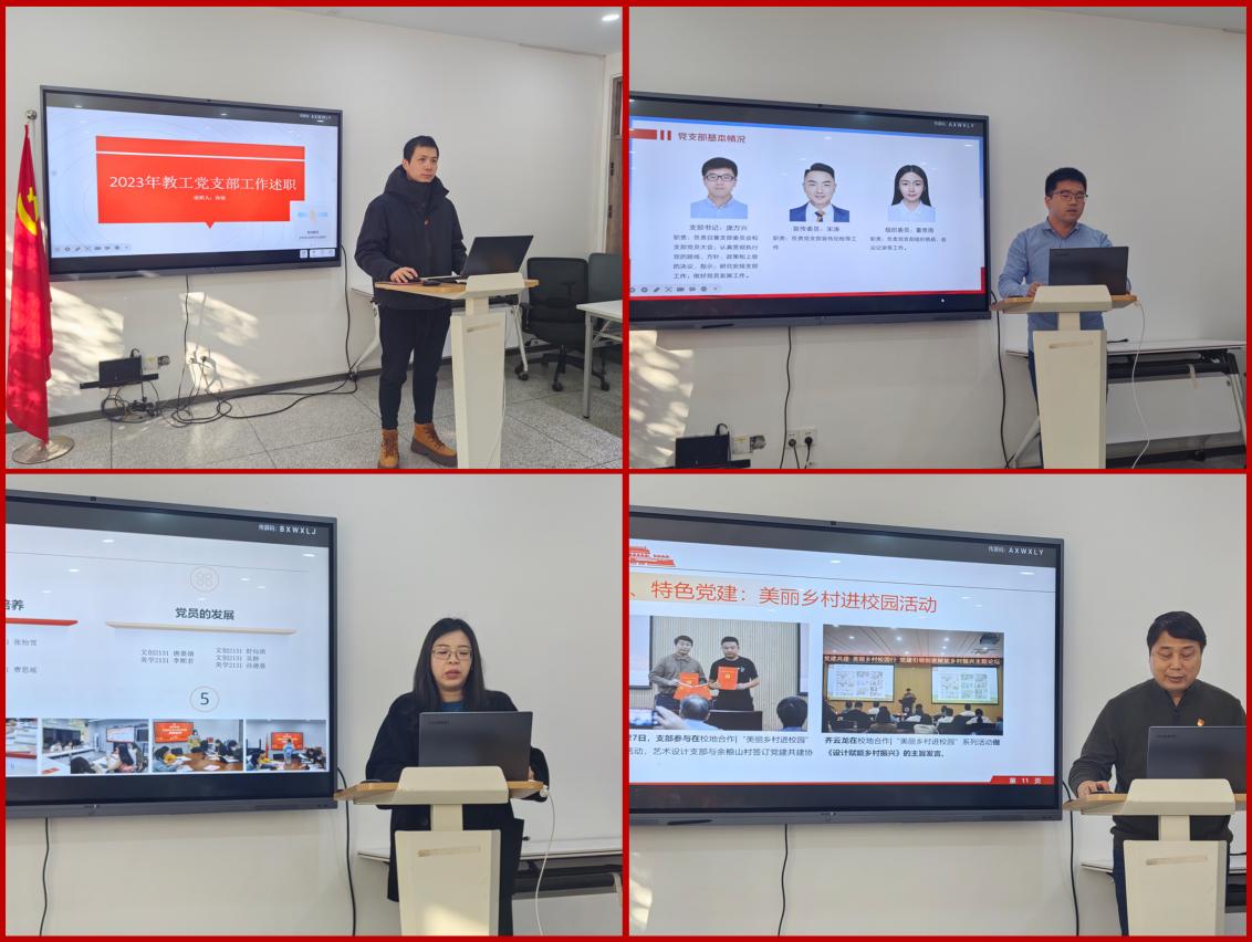 会上,产品艺术设计学生党支部书记林梦霞、教工党支部书记孙迪、艺术设计学生党支部书记齐云龙、工业设计学生党支部书记庞万兴分别进行了现场述职。各支部书记汇报支部一年来的建设情况,重点围绕党建基础工作、党建联建、支部特色品牌创建、现存的问题以及未来工作展望等方面进行了详细的汇报。