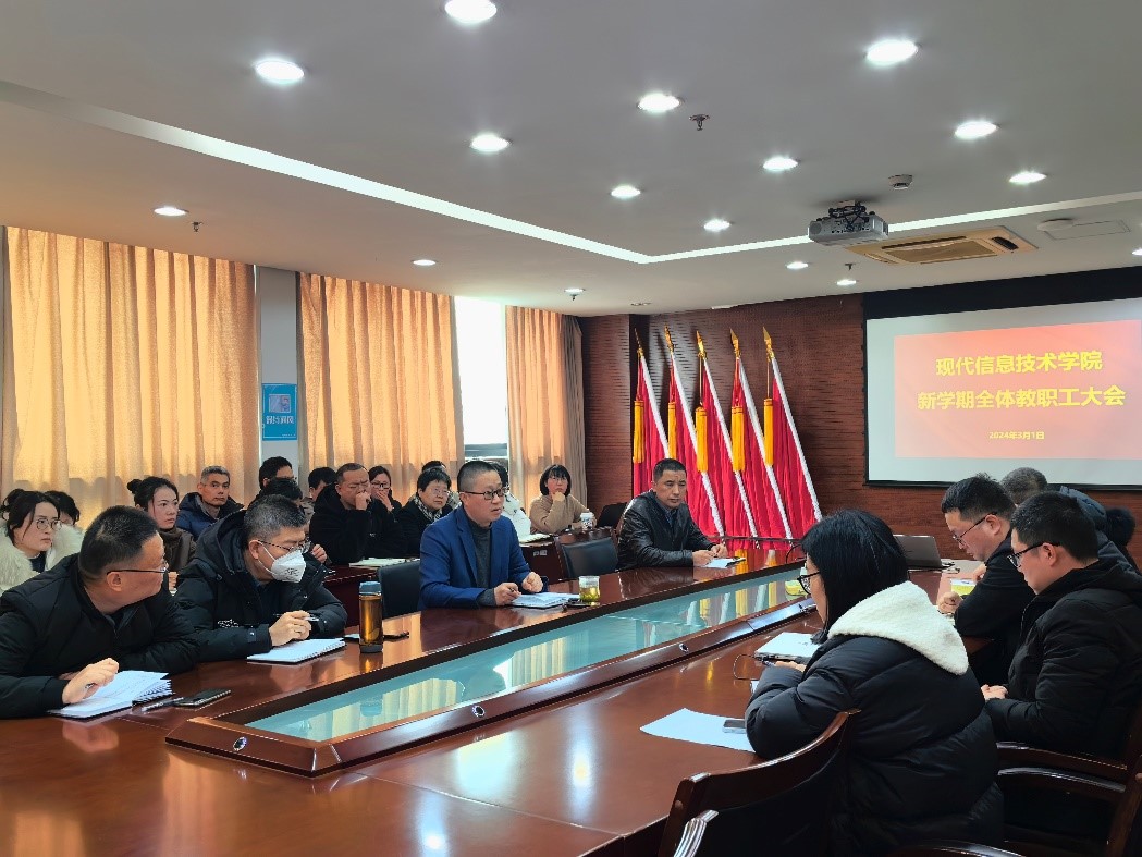 3月1日下午,现代信息技术学院召开新学期教职工大会,学院领导班子和全体教职工参加会议,会议由院长卢涤非主持。