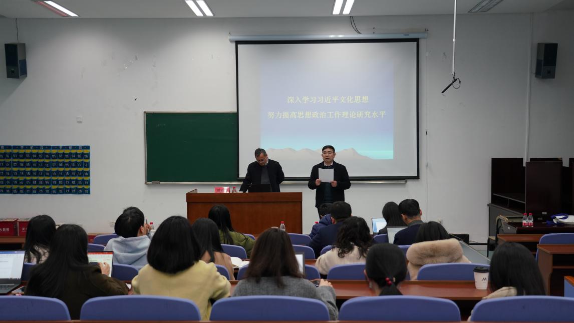 为深入学习贯彻习近平文化思想,着力加强思想政治工作的理论研究,提升学校思想政治教育的理论研究水平,校党委宣传统战部、马克思主义学院(思想政治理论教研部)联合举办思想政治工作理论研究系列学术讲座。近日,浙江省委党校科研处(决策咨询处)处长、浙江省习近平新时代中国特色社会主义思想研究中心首批研究员刘力锐教授作了题为《深入学习习近平文化思想,努力提高思想政治工作理论研究水平》的首场专题讲座。校党委宣传统战部长周琳参加,马克思主义学院院长、思想政治理论教研部主任查广云教授主持,来自各分院的党总支有关负责人、辅导员及全体思政课教师聆听了讲座。