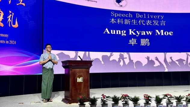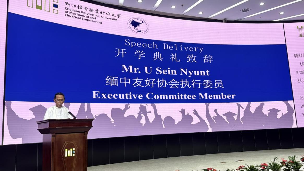 随后,缅中友协中央执委吴森纽(U Sein Nyunt)上台致辞。他高度评价了学校在推动区域间教育合作方面做出的贡献,对于我院爱护全体缅甸留学生表达了感谢。并鼓励留学生们珍惜在中国的学习机会,加深对中国文化的了解,成为连接两国友谊的桥梁,为中缅的合作和交流贡献力量。