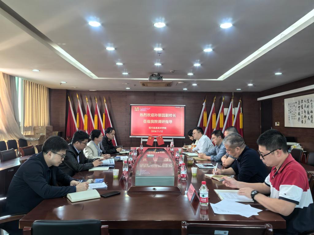 孙丽园副校长在听取了学院基本情况、师资队伍建设、科研及社会服务、产学研合作、实训室建设等方面的汇报后,充分肯定了现代信息技术学院近年来在学校党委领导下的工作成果,并就学院下一步发展提出了要求和希望。孙丽园指出,学院领导班子要积极学习贯彻党的二十届三中全会精神,适应职业本科的发展规律与发展标准,强化二级管理理念转变,做好内涵式发展,重点做好以下三个方面:一是明确新发展时期的定位。围绕国家战略和区域经济发展要求,做好人才培养、科学研究、社会服务等工作。加强科学研究与人才培养的适配度,培养学生的创新意识、科学精神、科研能力。坚持科教汇融,做好标志性科研成果的显示,提升科研软实力。二是明确人才是重点。加强师资队伍建设,坚持外引与内培相结合,在大力“引进来”的同时,积极培养本校教师攻读博士学位,兼顾教师分类发展。围绕高层次人才、青年博士、重点团队,积极打造高水平专业教师团队,优先引进在国内外具有较高学术声誉、能够带领团队开展高水平科研的领军人才及学术团队。三是明确目标是关键。学院领导班子要坚决贯彻执行学校的统一部署与决策,以目标为导向,以考核为抓手,充分发挥信息学院的优势,积极调动教职工的积极性,确保学校发展战略与各项工作目标的顺利实现。