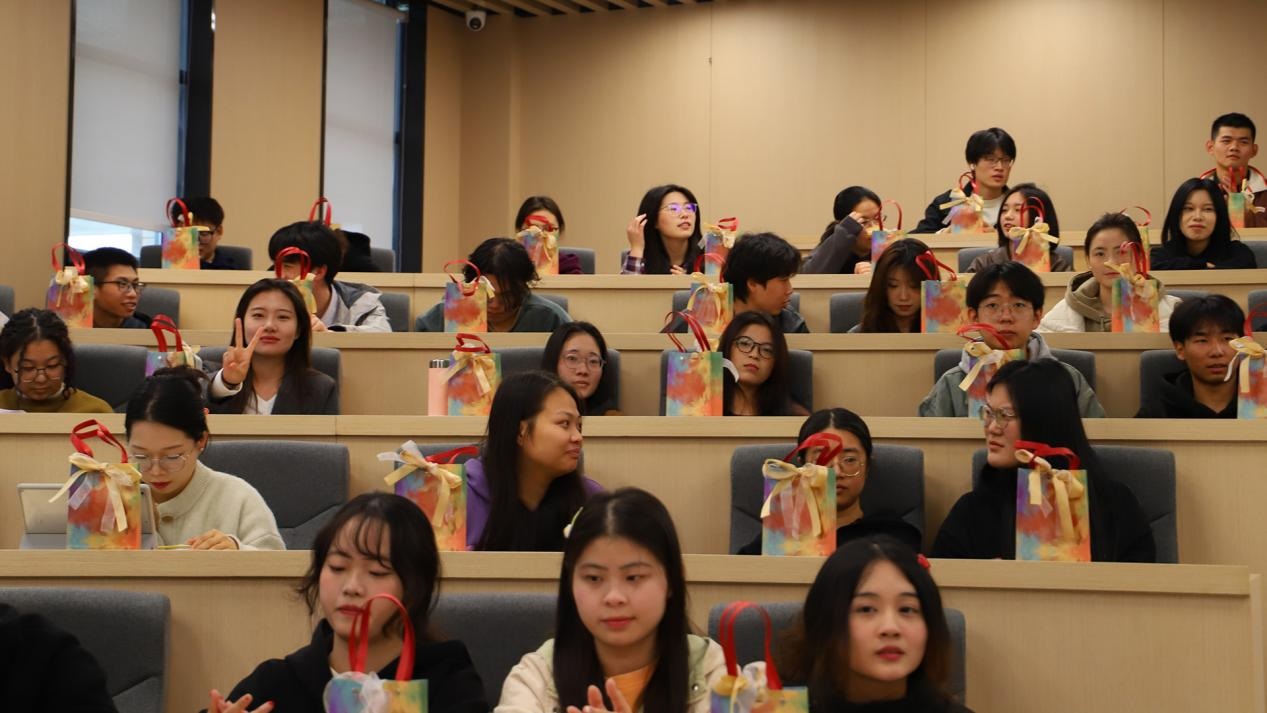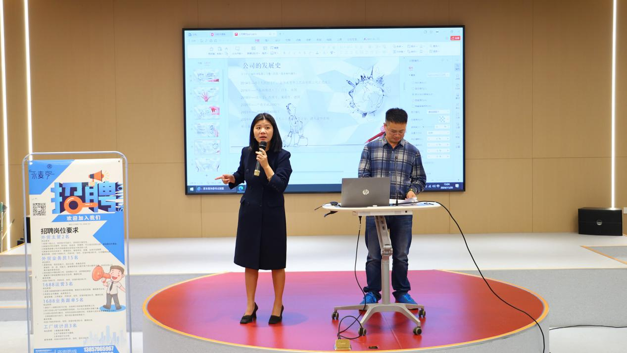 第一场由金华永麦亨工艺品有限公司总经理傅瑜晨主讲,她作为学院的校友,给同学们分享自身的创业经历及对毕业生职业规划的建议,随后为同学们讲解了实习会计、外贸业务员等岗位信息,就毕业生关注的薪资福利待遇及工作时间等问题进行了交流答疑。傅经理还为毕业生精心准备了纪念品,现场洋溢着一种积极向上的交流氛围。