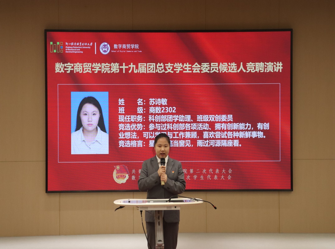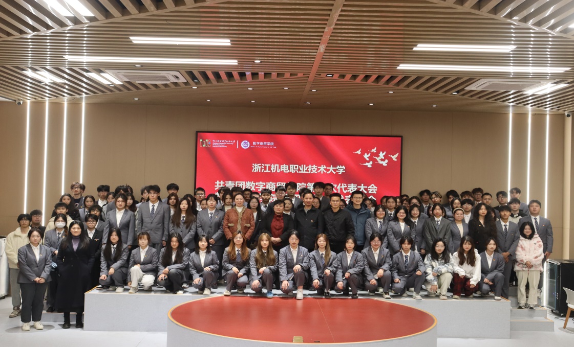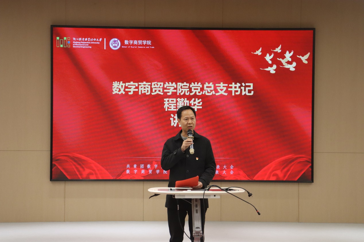 在全校上下深入学习贯彻落实党的二十届三中全会精神之际,在努力冲刺重大项目建设关键之刻,在全体师生奋力创建在高水平职业技术大学之时,11月27日晚17:30,共青团数字商贸学院第二次团员代表大会、学院第四次学生代表大会(以下简称团学“双代会”)在海宁校区19号楼106会议室顺利召开。数字商贸学院党总支书记程勤华、党总支副书记李君、团总支书记杨秀飞、全体辅导员、学院第十八届团总支学生会委员以及各团支部学生代表共120余人出席本次大会。