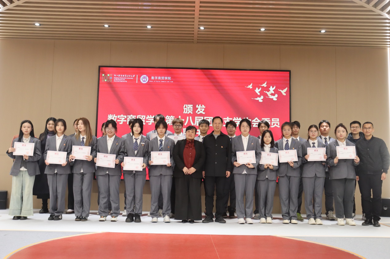 最后,学院党总支书记程勤华代表学院党政领导班子向大会的成功召开表示热烈祝贺。程勤华强调学院的团学代会是全院青年政治生活中的大事,它承载着全体商贸学子对过去一年工作的回顾和总结,更寄托着对未来发展的期望与憧憬。在历届团总支学生会的共同努力下我们取得一系列令人瞩目的成绩:蝉联三次校运动会道德风尚奖,每年运动会女子团体总分第一,2024年更是获得了中国国际大学生创新大赛国赛金奖的历史最好成绩。从精彩纷呈的校园活动到在各项赛事中为学院争得荣誉的拼搏瞬间,每一项成功都凝聚团队的力量,也是青春奋斗的精彩华章。对于新一届团总支学生会,程勤华要求大家能够秉承团学工作的优良传统,以服务同学为宗旨,以提升校园文化品质为目标,以“三求”校训为行动指南,积极发挥桥梁和纽带作用,不断创新工作方式方法,运用现代信息技术手段,拓展团学工作的广度和深度,持续打造一个充满凝聚力和战斗力的团学组织。程勤华还代表学院对第十八届团总支学生会全体成员过去一年的辛苦付出表达衷心的感谢,并为全体第十八届委员颁发聘书。