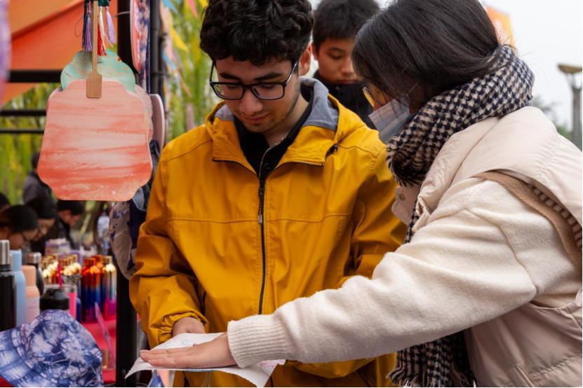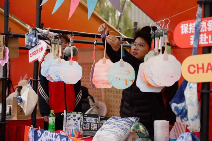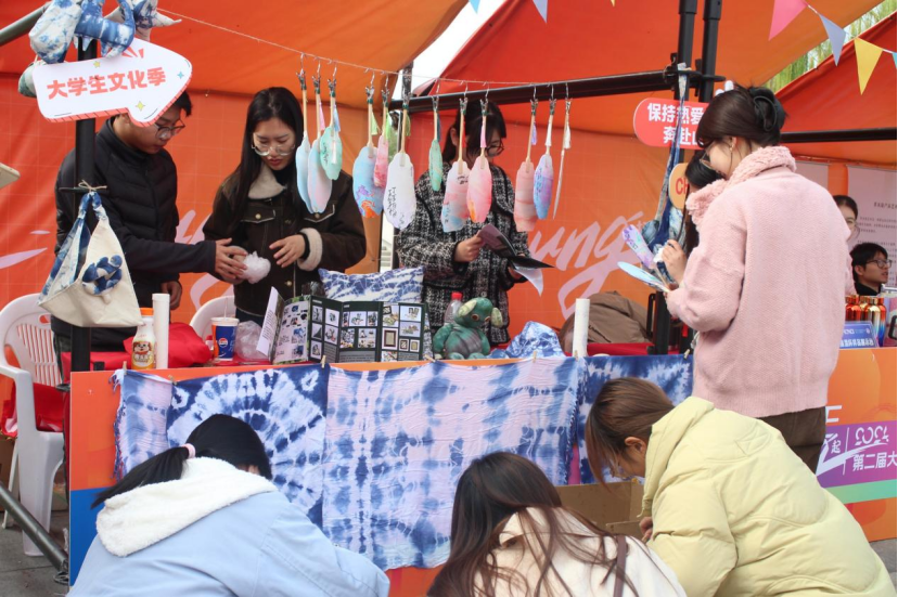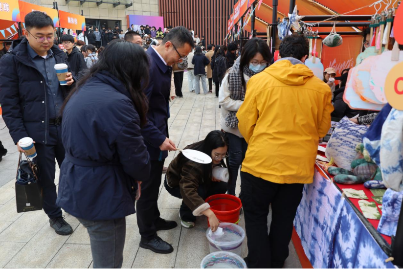 12月6日,“潮青年·一起‘young’”第二届大学生文化季(海宁)在浙江机电职业技术大学海宁校区隆重启动,学院“布可思艺”艺术工坊作为学校“一校一品”艺术设计展之一,以其独特的魅力吸引了众多目光,成为一道亮丽的风景线。摊位上不仅展示了精美的扎染作品,还提供了漆扇制作的互动体验,让师生们亲身体验到了非物质文化遗产的独特韵味与深厚底蕴。