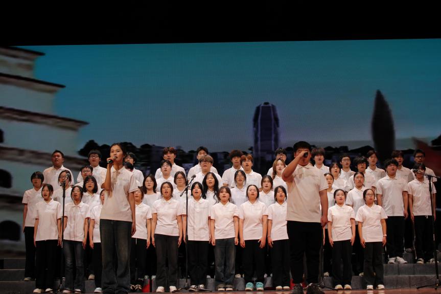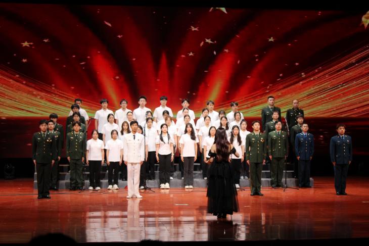他们身着军装,歌声犹如出征的战鼓目出了古往今来英雄们对家国的忠诚与担当。同学们目光坚定,身姿挺拔,那磅礴的气势仿佛要冲破时空的界限,与历史上的爱国志士并肩作战。