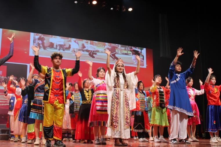 时光飞逝,在谢幕节目《相亲相爱一家人》悠扬的旋律下,数字商贸学院全体学生党员和入党积极分子身着中国五十六个民族的传统服饰,相继来到舞台中央,与晚会所有演职人员及志愿者汇聚一堂,他们用欢快的舞蹈,带动起全场氛围。至此,他们用最真挚的情感、最饱满的热情,为我们展现了一场无与伦比的音乐盛宴,让我们铭记这样一个难忘的夜晚。