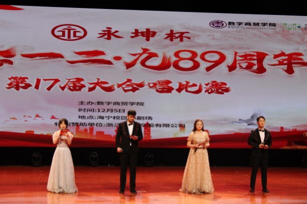 回望 1935 年 12月9日,北平的青年学子们在中国共产党的引领下,发起了波澜壮阔的抗日救亡爱国运动,唤醒了亿万同胞的民族意识。89年光阴荏苒,那份激昂的爱国情怀和青年的热血担当,依旧在青年学子的心中燃烧。为传承“一二·九”运动的坚毅不拔、探求真理、敢于实践的民族精神,数字商贸学院于 12月5日晚17:30在海宁校区小剧场举办“永坤杯”纪念“一二·九”运动 89 周年暨第十七届大合唱比赛。