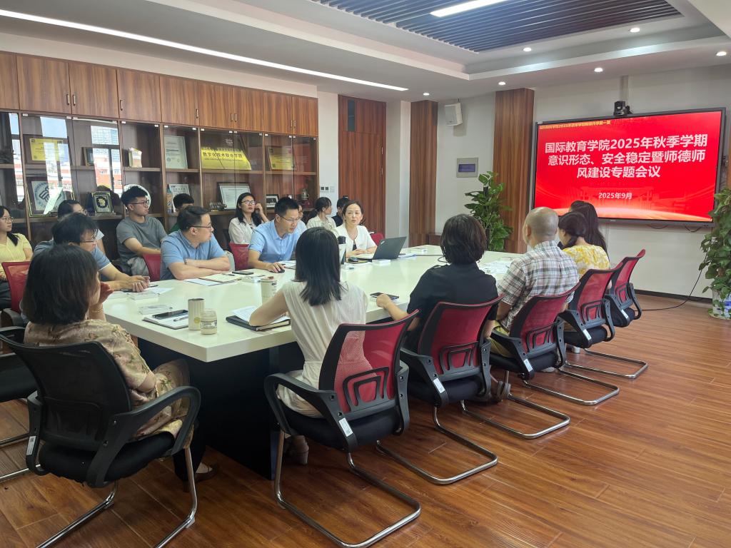 为进一步强化教师队伍建设,筑牢校园意识形态安全屏障,9月5日上午,国际教育学院召开2025年秋季学期意识形态、安全稳定暨师德师风建设专题会议,学院领导班子及全体教职工参会。会议由学院党委书记高水琴主持。