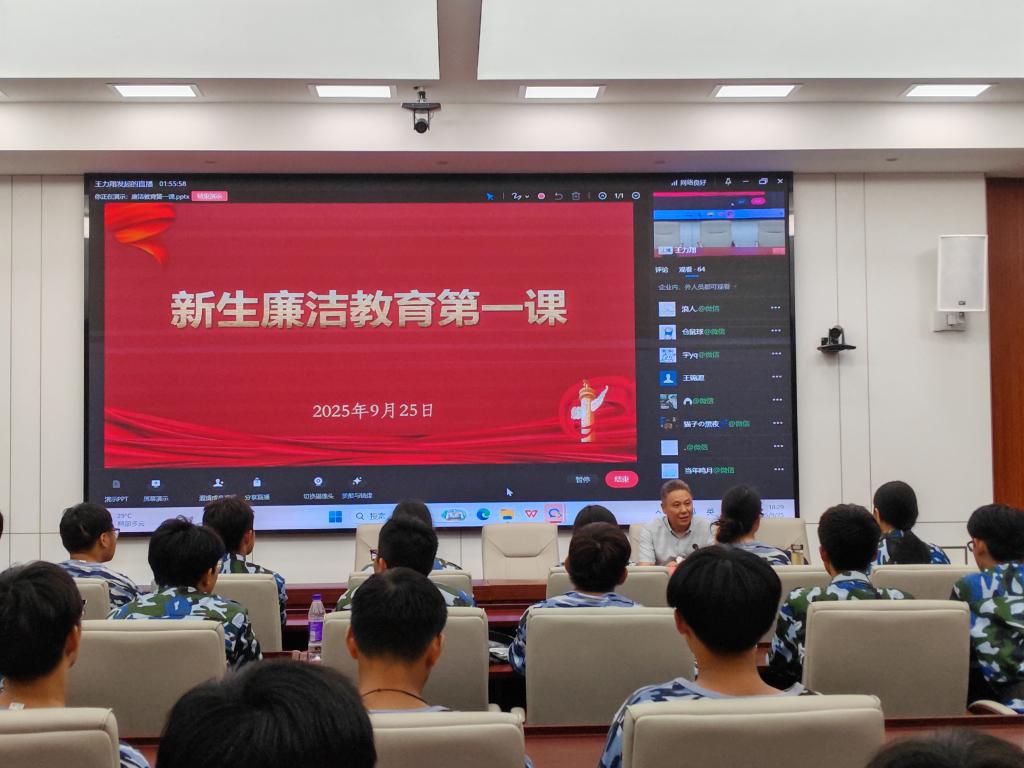为深入贯彻中央八项规定精神学习教育,扎实推进清廉校园建设,帮助2025级新生筑牢廉洁思想根基、扣好人生“第一粒扣子”,9月25日晚,2025级新生“廉洁教育第一课”在五号楼2号厅如期举行,学校纪检监察室、学工部和滨江校区新生代表现场参会,其余新生通过线上直播同步收看,共同接受一场浸润心灵的廉洁思想洗礼。