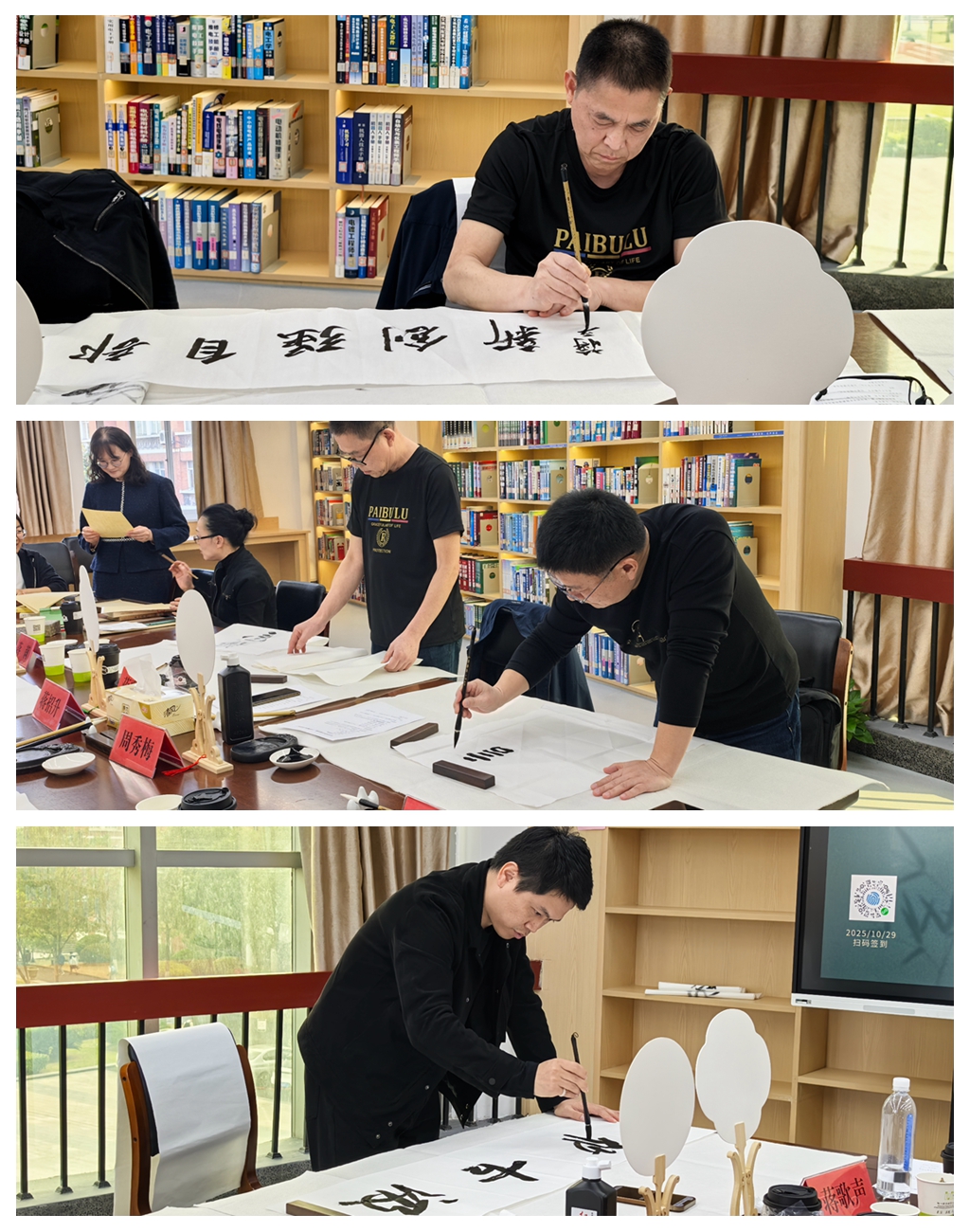 2025年10月29日下午,滨江校区图书馆三楼教研支持中心墨香四溢、雅韵悠扬,以“翰墨书香·匠心机电”为主题的书法创作与展示活动在此成功举办。活动特邀图书馆原馆长蒋歌声、公共基础教学部陈锦、体育艺术部蒋招升、图书馆蒋莉等书法指导嘉宾,与南岸书画社、阅读推广协会成员等书法爱好者齐聚一堂,以笔墨为媒,共赴一场传统文化与现代校园的深度对话。