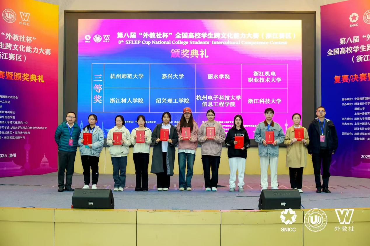 11月21日-23日,第八届“外教社杯”全国高校学生跨文化能力大赛在温州举行。经过激烈角逐,我校代表队在本科赛道中表现突出,荣获浙江省三等奖。