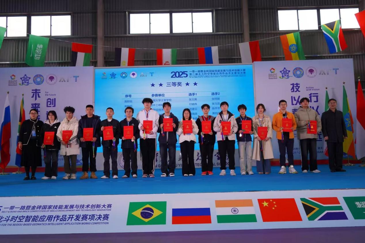 在2025年11月21日至23日于武汉举办的2025“一带一路”暨金砖国家技能发展与技术创新大赛第二届“北斗时空智能应用作品开发”赛项全国决赛中,我校代表队与来自全国多省的86支高职、本科等队伍同台竞技。最终,我校智慧交通学院学生(汽车智能技术专业)斩获高职组一等奖第一名、本科组二等奖第一名及高职组两项三等奖的优异成绩。两组同学代表中国出征北非国际赛,同时为学校赢得了“最佳组织奖(高职组)”“优秀组织奖(本科组)”的宝贵荣誉,终于在历时半年多的备赛之路上迎来了属于他们的高光时刻。