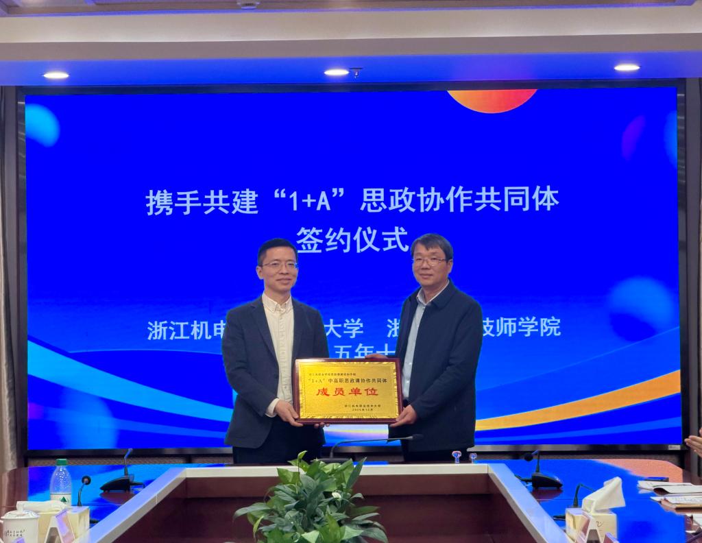 在协作共同体单元签约授牌仪式上,浙江机电职业技术大学党委副书记彭杨发表讲话。他指出,“1+A”协作共同体要切实立足职业教育类型特点,以共同体建设为契机,打破学段壁垒,抓好育人资源整合,推动中高职思政课教学内容贯通、师资队伍共建、评价体系协同,共同打造“真理的味道”职业教育思政金课,培养更多德技并修的高素质技术技能人才。浙江建设技师学院党委书记徐永良表示,作为协作共同体成员单位,学校将科学定位学段思政课教学目标,积极发挥技师学院校地合作、产教融合优势,高度重视、主动融入思政课共同体建设,为推进全省中高职思政一体化发展做出技师学院的贡献。随后,彭杨副书记代表浙江机电职业技术大学为浙江建设技师学院授牌,徐永良书记代表学院接牌,标志着双方正式结成思政课建设协作共同体,将凝心聚力开创中高职思政课一体化建设新局面。浙江机电职业技术大学马克思主义学院院长查广云与浙江建设技师学院思政部主任吉庆还代表双方签订了协作共同体单元合作协议。浙江机电职业技术大学马克思主义学院党总支书记熊峰代表学院向浙江建设技师学院思政部赠送了《之江匠心》图书。