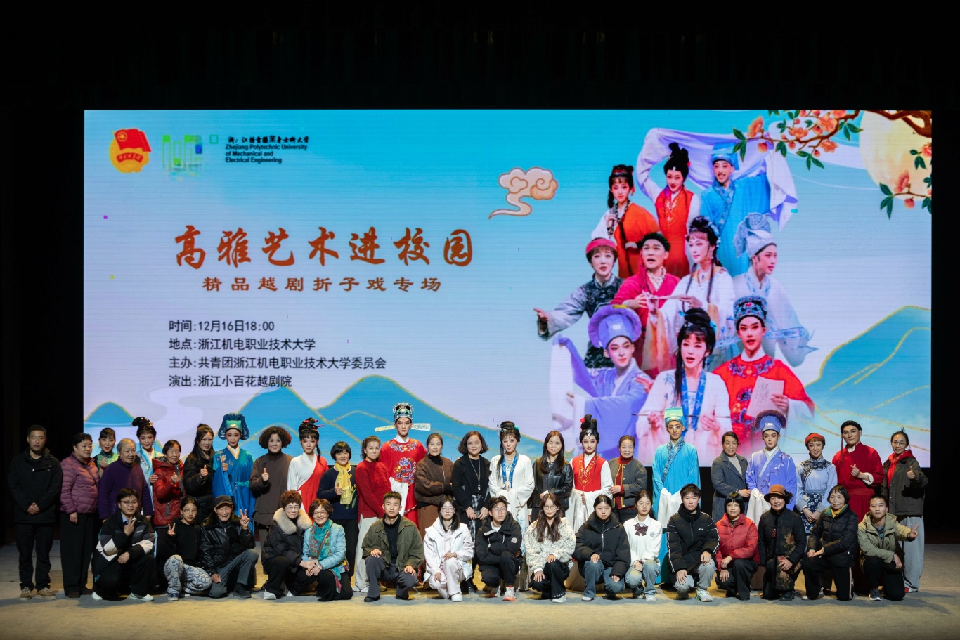 为进一步强化学校美育的育人功能,将高雅艺术进校园作为学校美育培根铸魂的重要载体与美育浸润行动的核心内容,12月16日,在浙江机电职业技术大学海宁校区小剧场举办“高雅艺术进校园——浙江小百花越剧院机电专场”演出。学校师生与属地受邀嘉宾共500余人齐聚一堂,在婉转的越剧唱腔中感受中华优秀传统文化底蕴,共同参与这场以美育人、以美化人的文化盛宴。