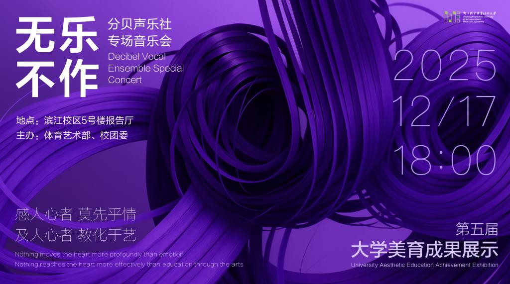 12月17日晚,第五届大学美育教学成果展示系列活动之“无乐不作”分贝声乐社专场音乐会,在滨江校区5号楼报告厅温情启幕。本次音乐会以“无乐不作”为主题,通过多元曲风的真挚演绎,生动彰显了美育浸润下的校园文化活力,充分展现了同学们扎实的艺术素养与细腻的情感表达力。旋律起伏间,一场关于青春、成长与热爱的集体对话缓缓铺展,吸引了三百余名同学到场聆听,现场氛围热烈而温馨。