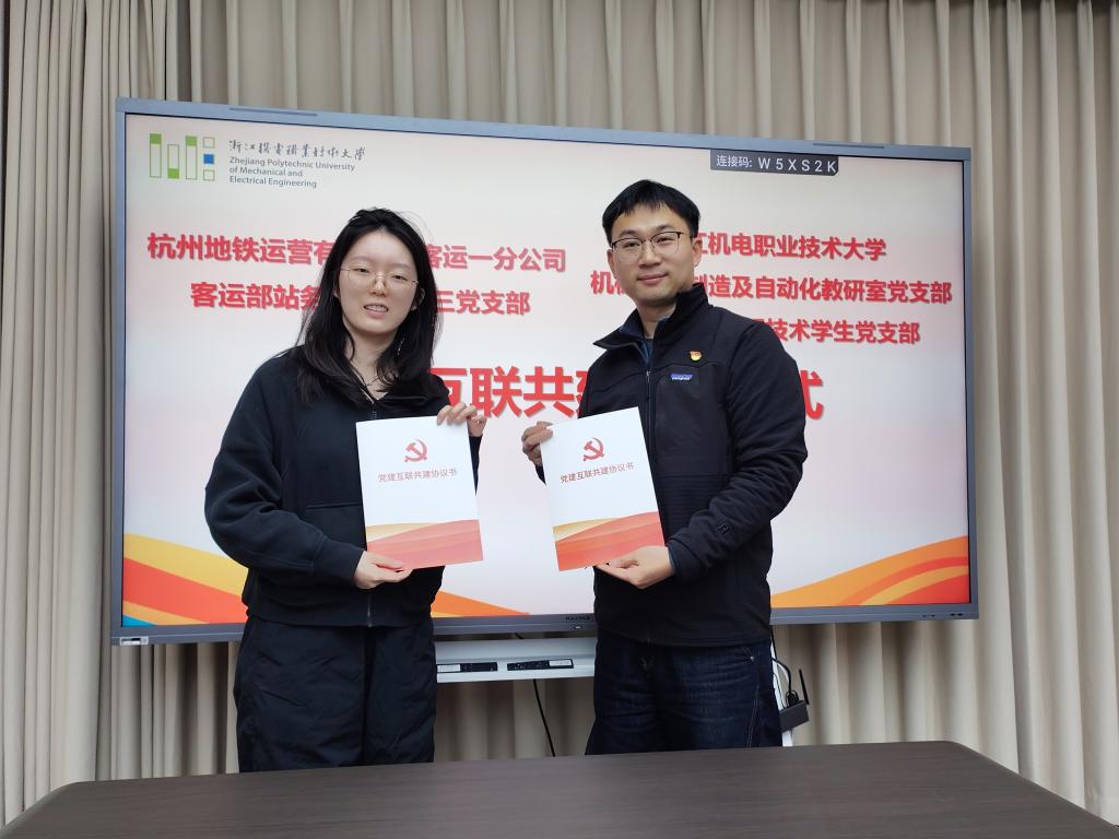 会上,副站区长徐家豪、客服管理工程师朱彦恢、智能建维部经理李超越与学院机械设计制造及自动化教研室党支部书记杨天玲及智能制造工程技术学生党支部书记孙佳晨进行了业务交流,在党建互联共建项目开展工作方面达成了共识。杭州地铁运营有限公司客运一分公司客运部站务二中心第三党支部分别与机械设计制造及自动化教研室党支部、制造工程技术学生党支部签订了党建共建协议。