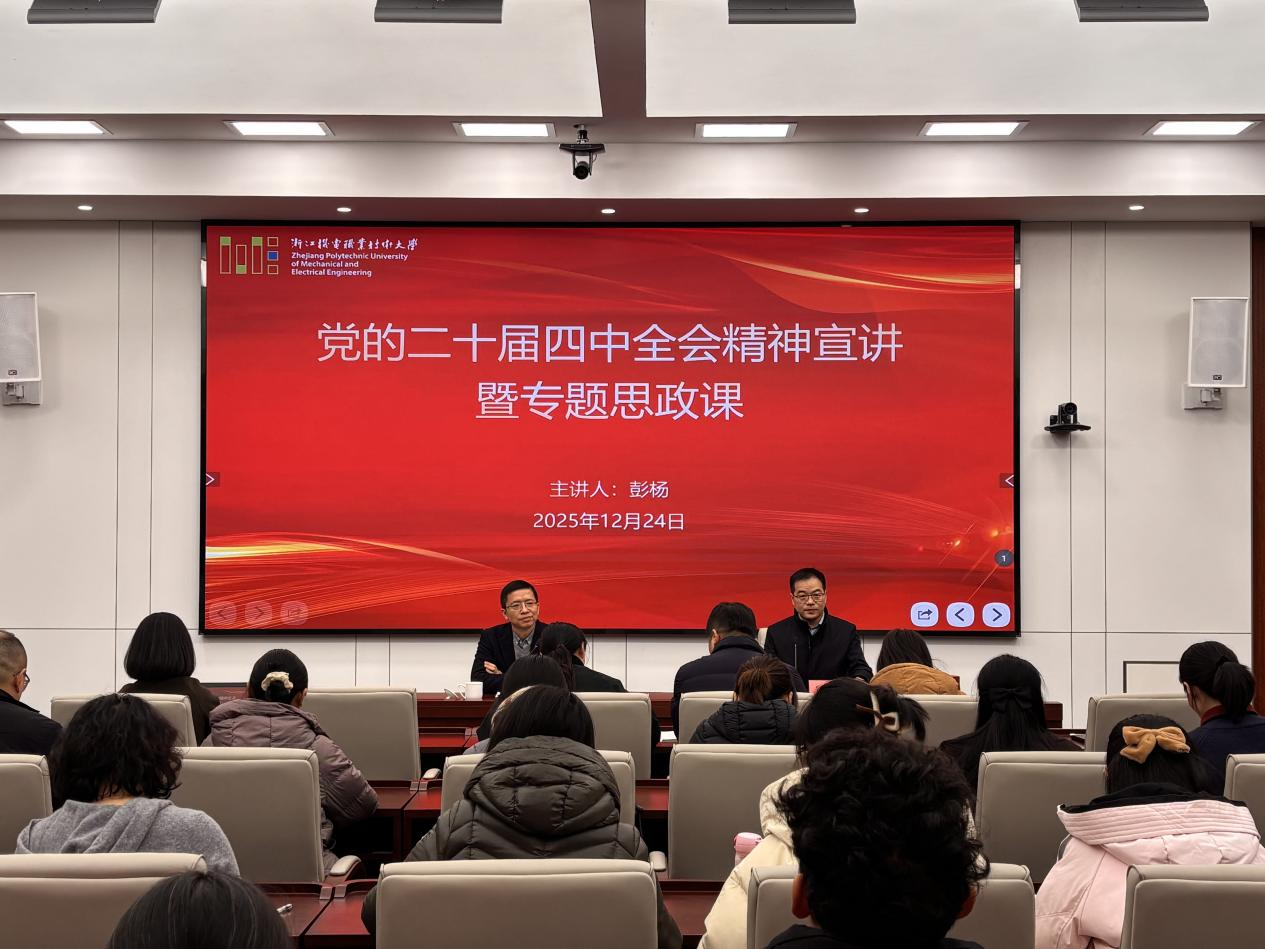 为深入学习领会党的二十届四中全会精神,准确把握“十五五”时期国家发展宏伟蓝图,并将其全面融入办学治校全过程,12月24日下午,浙江机电职业技术大学党委副书记彭杨在马克思主义学院作党的二十届四中全会精神宣讲暨专题思政课。学院党总支书记熊峰主持,学院全体教师及相关学生代表参加。