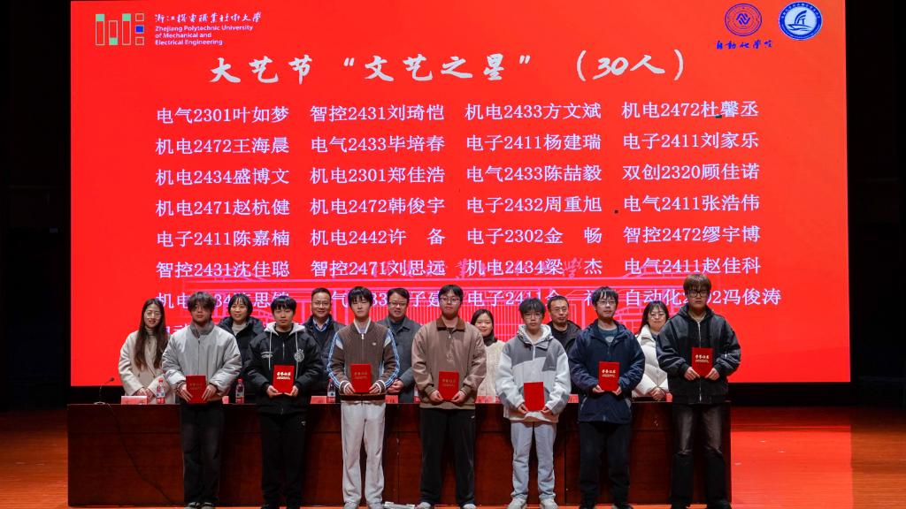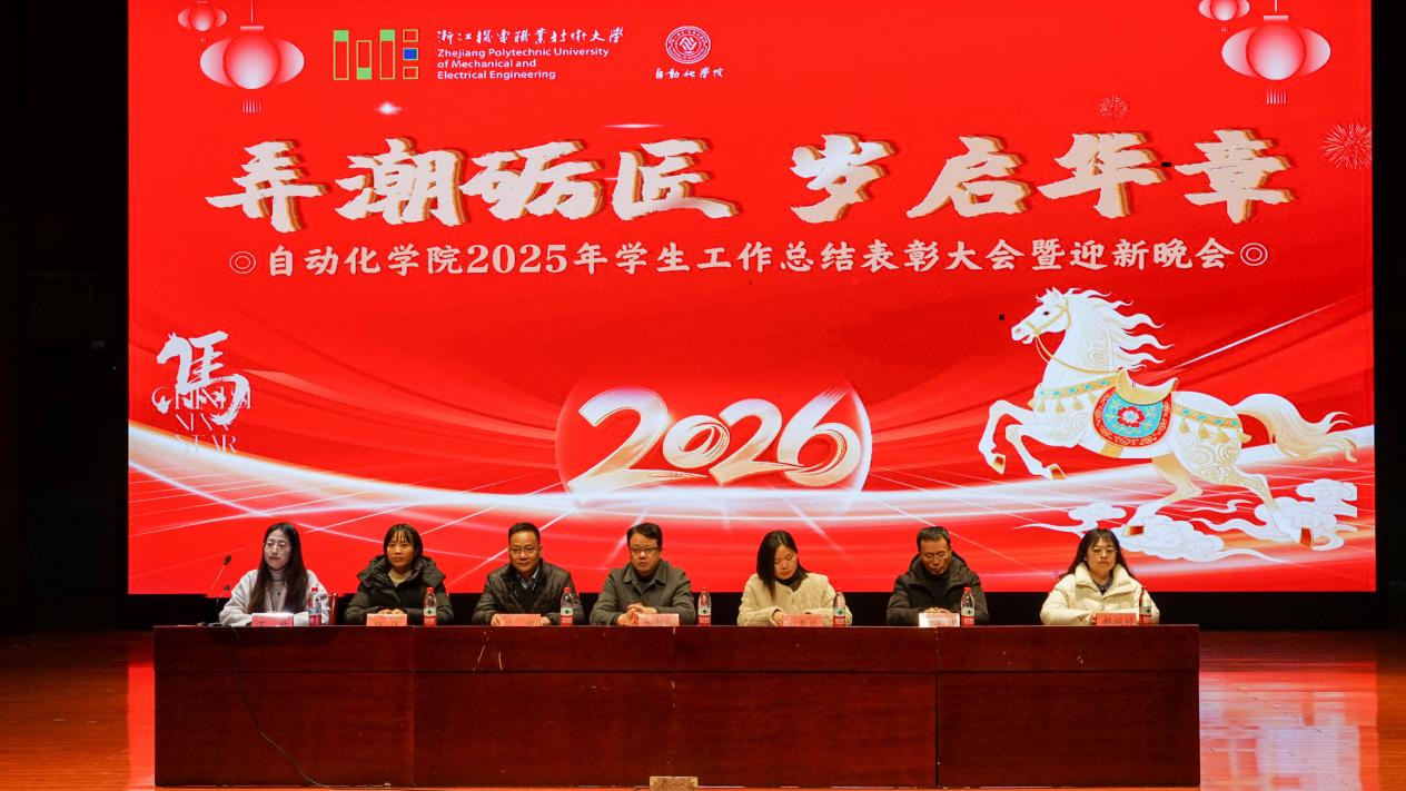 12月24日晚,自动化学院在海宁校区小剧场隆重举行“弄潮砺匠,岁启华章”2025年学生工作总结表彰大会暨迎新晚会。学院党委书记刘哲纬,党委副书记方惠玲,副院长吕俊及各办主管出席大会。全体辅导员、教师代表与各年级学生代表共同参会。大会由学工办主管沈丹主持。师生齐聚一堂,共同回顾过去一年的奋斗历程。