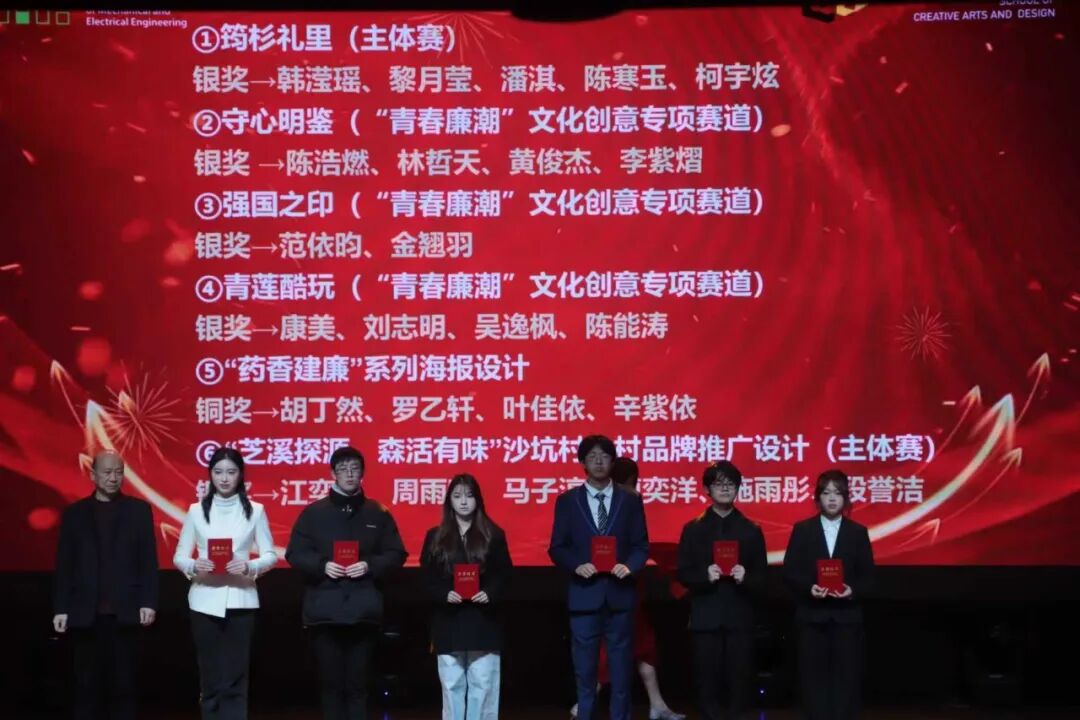 高光所向,荣光所至。本次颁奖典礼延续了创意设计学院一贯坚持和倡导的育人文化,是聚焦“技术与艺术相融合,培养创新型高技术技能人才”的人才培养目标的体现。2025年各类奖项依次揭晓,涵盖“最美优秀学生干部”“最美班级”等6大类“最美”奖项,以及在省级乡村振兴与国家级“两山杯”赛事和校廉洁文化作品设计大赛中取得突出成绩的团队与个人。一张张证书,是肯定更是期许;一个个身影,是榜样更是力量。他们以行动诠释“艺路向阳”的精神,激励全体师生在新的一年里继续向前、向上。