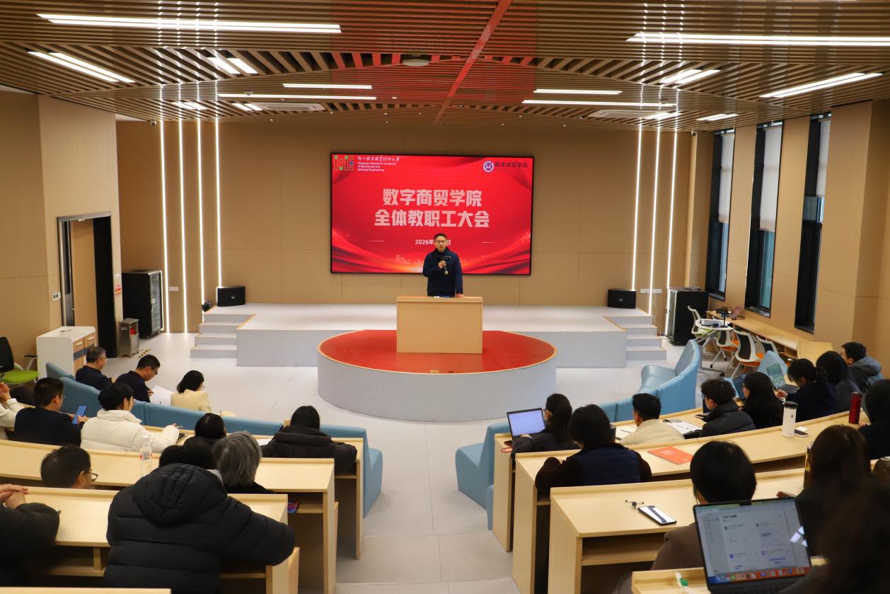 3月5日上午,数字商贸学院召开新学期全体教职工大会,传达学校新学期会议精神、开展新学期教职工政治理论学习、部署2026年重点工作。学院领导班子成员及全体教职工参加会议,会议由学院党委副书记(主持工作)钟毅主持。