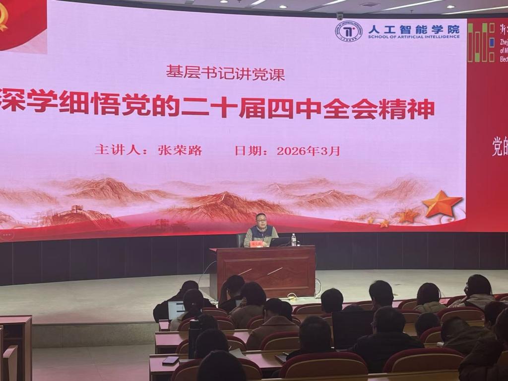 为深入学习贯彻党的二十届四中全会精神,引导广大党员干部准确把握“十五五”时期经济社会发展的重大战略部署,切实把思想和行动统一到全会精神上来,人工智能学院在学术报告厅隆重举行党组织书记讲党课活动。学院党委书记张荣路以《深学细悟党的二十届四中全会精神》为题,为全院科级以下干部、学生党员带来一场主题鲜明、内涵丰富的专题党课,正式拉开学院学习贯彻党的二十届四中全会精神专题培训的序幕。本次党课作为专题培训的开班动员暨首场专题辅导,既是学院党委落实上级部署、强化理论武装的重要举措,也是推动党建与事业发展深度融合的具体实践。